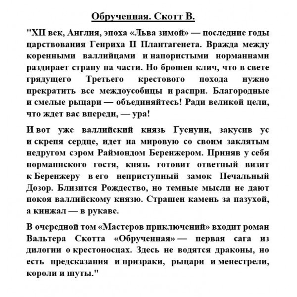 В очередной том "Мастеров приключений" входит роман Вальтера Скотта "Обрученная" — первая сага из дилогии о крестоносцах. Здесь не водятся драконы, но есть предсказания и призраки, рыцари и менестрели, короли и шуты."