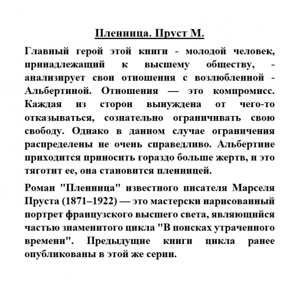 Роман "Пленница" известного писателя Марселя Пруста (1871-1922) - это мастерски нарисованный портрет французского высшего света, являющийся частью знаменитого цикла "В поисках утраченного времени". Предыдущие книги цикла ранее опубликованы в этой же серии.