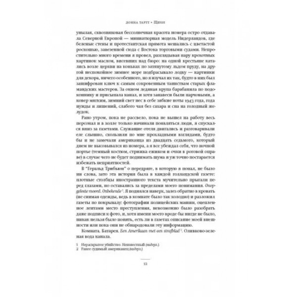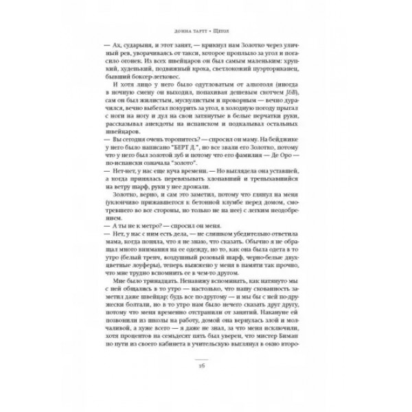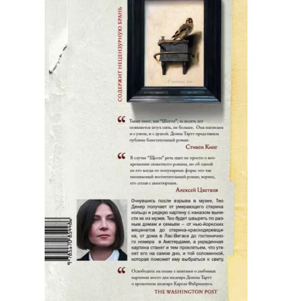 Роман, который лауреат Пулитцеровской премии Донна Тартт писала более 10 лет, — огромное эпическое полотно о силе искусства и о том, как оно — подчас совсем не так, как нам того хочется — способно перевернуть всю нашу жизнь. 13-летний Тео Декер чудом остался жив после взрыва, в котором погибла его мать. Брошенный отцом, без единой родной души на всем свете, он скитается по приемным домам и чужим семьям — от Нью-Йорка до Лас-Вегаса, — и его единственным утешением, которое, впрочем, чуть не приводит к его гибели, становится украденный им из музея шедевр голландского старого мастера.