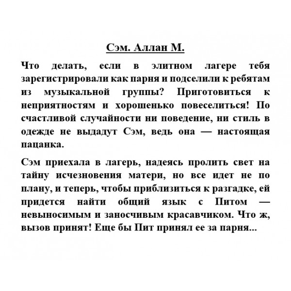Сэм приехала в лагерь, надеясь пролить свет на тайну исчезновения матери, но все идет не по плану, и теперь, чтобы приблизиться к разгадке, ей придется найти общий язык с Питом — невыносимым и заносчивым красавчиком. Что ж, вызов принят! Еще бы Пит принял ее за парня...