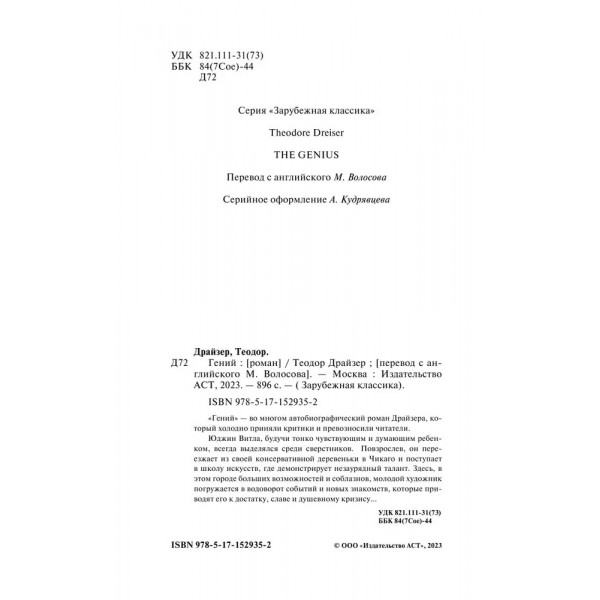"Гений" - во многом автобиографический роман Драйзера, который холодно приняли критики и превозносили читатели. Юджин Витла, будучи тонко чувствующим и думающим ребенком, всегда выделялся среди сверстников. Повзрослев, он переезжает из своей консервативной деревеньки в Чикаго и поступает в школу искусств, где демонстрирует незаурядный талант. Здесь, в этом городе больших возможностей и соблазнов, молодой художник погружается в водоворот событий и новых знакомств, которые приводят его к достатку, славе и душевному кризису…