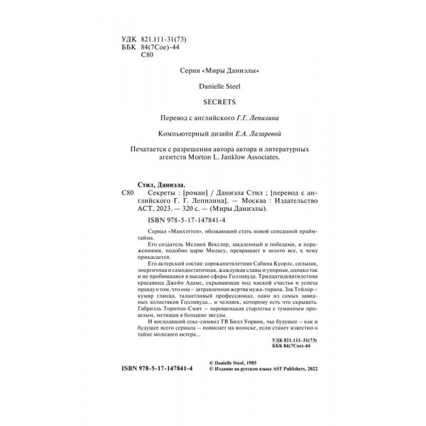 Сериал "Манхэттен", обещающий стать новой сенсацией прайм-тайма. Его создатель Мелвин Векслер, закаленный и победами, и поражениями, подобно царю Мидасу, превращает в золото все, к чему прикасается. Его актерский состав: сорокапятилетняя Сабина Куорлс, сильная, энергичная и самодостаточная, жаждущая славы и упорная, однако так и не пробившаяся в высшие сферы Голливуда. Тридцатидевятилетняя красавица Джейн Адамс, скрывающая под маской счастья и успеха правду о том, что она – затравленная жертва мужа-тирана. Зак Тейлор – кумир глянца, талантливый профессионал, один из самых завидных холостяков Голливуда... и человек, которому есть что скрывать. Габриэль Торнтон-Смит – хорошенькая старлетка с туманным прошлым, метящая в большие звезды. И восходящий секс-символ ТВ Билл Уорвик, чье будущее – как и будущее всего сериала – повиснет на волоске, если станет известно о тайне молодого актера...