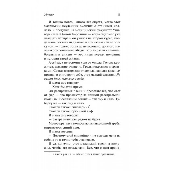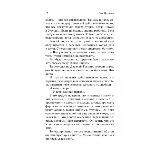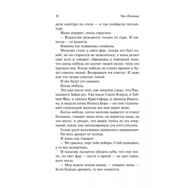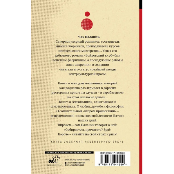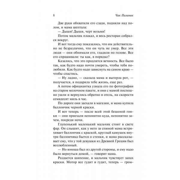 Книга о молодом мошеннике, который каждодневно разыгрывает в дорогих ресторанах приступы удушья – и зарабатывает на этом неплохие деньги...Книга о сексоголиках, алкоголиках и шмоткаголиках. О любви, о дружбе и философии. О сомнительном "втором пришествии" – и несомненной "невыносимой легкости бытия" наших дней. Впрочем, сам Паланик говорит о своем романе: "Собираетесь прочитать? И зря! "Однако прочитать все же стоит – на свой страх и риск!