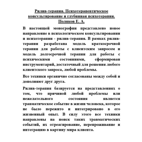 В настоящей монографии представлено новое направление в психологическом консультировании и психотерапии - рилив-терапия. В рамках рилив-терапии разработана модель краткосрочной терапии для работы с клиентским запросом и модель долгосрочной терапии для работы с психическими состояниями, сформирован инструментарий, достаточный для решения любого клиентского запроса, любой проблемы.