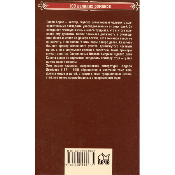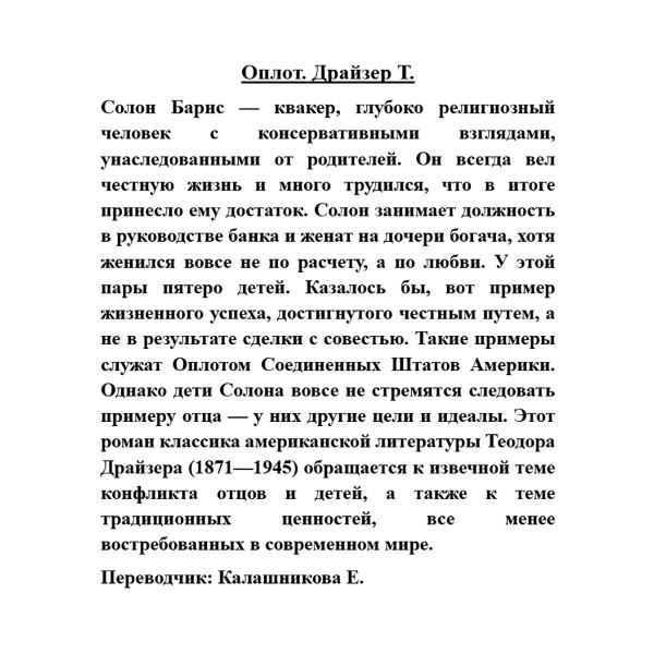 Солон Барнс — квакер, глубоко религиозный человек с консервативными взглядами, унаследованными от родителей. Он всегда вел честную жизнь и много трудился, что в итоге принесло ему достаток. Солон занимает должность в руководстве банка и женат на дочери богача, хотя женился вовсе не по расчету, а по любви. У этой пары пятеро детей. Казалось бы, вот пример жизненного успеха, достигнутого честным путем, а не в результате сделки с совестью. Такие примеры служат Оплотом Соединенных Штатов Америки. Однако дети Солона вовсе не стремятся следовать примеру отца — у них другие цели и идеалы. Этот роман классика американской литературы Теодора Драйзера (1871—1945) обращается к извечной теме конфликта отцов и детей, а также к теме традиционных ценностей, все менее востребованных в современном мире.