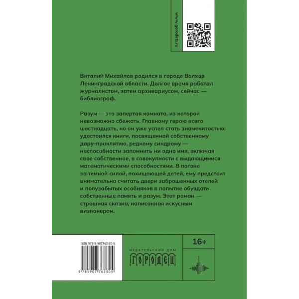 В триллере-головоломке Виталия Михайлова дети пропадают из закрытых комнат, а руки тех, кто намечен в будущие жертвы, покрываются черными язвами в виде замочных скважин. Спасенья нет, только отсрочка: если не ты, то кто-то другой. В кинематографически выверенной череде сновидчески-сюрреалистических эпизодов главный герой мучительно ищет и того, кто повинен в краже детей, и того, кто поможет открыть ему запертую комнату собственного уникального и парадоксального сознания. Разум — это запертая комната, из которой невозможно сбежать. Главному герою всего шестнадцать, но он уже успел стать знаменитостью: удостоился книги, посвященной собственному дару-проклятию, редкому синдрому — неспособности запомнить ни одно имя, включая свое собственное, в совокупности с выдающимися математическими способностями. В погоне за темной силой, похищающей детей, ему предстоит внимательно считать двери заброшенных отелей и полузабытых особняков в попытке обуздать собственные память и разум. Этот роман — страшная сказка, написанная искусным визионером.