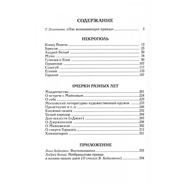 В книгу вошли сборник "Некрополь", составленный автором в 1939 году, очерки разных лет, печатавшиеся в российских и зарубежных изданиях, а также воспоминания его жены Анны Ходасевич и статья Андрея Белого о поэзии Ходасевича.