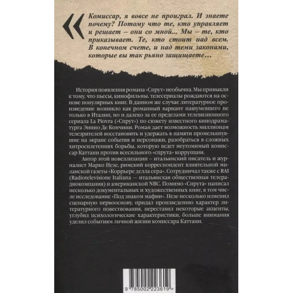 История появления романа "Спрут" необычна. Мы привыкли к тому, что пьесы, кинофильмы, телесериалы рождаются на основе популярных книг. В данном же случае литературное произведение возникло как романный вариант нашумевшего не только в Италии, но и далеко за ее пределами телевизионного сериала La Piovra ("Спрут") по сюжету известного кинодраматурга Эннио Де Кончини. Роман дает возможность миллионам телезрителей восстановить и удержать в памяти промелькнувшие на экране события и персонажи, разобраться в сложных хитросплетениях борьбы, которую ведет неутомимый комиссар Каттани против всесильного "спрута" коррупции. Автор этой новеллизации – итальянский писатель и журналист Марко Незе, римский корреспондент влиятельной миланской газеты "Коррьере делла сера". Сотрудничал также с RAI (Radiotelevisione Italiana — итальянская общественная телерадиокомпания) и американской NBC. Помимо "Спрута" написал несколько документальных и художественных книг, в том числе исследование "Под знаком мафии". Незе несколько изменил сценарную первооснову, придал произведению характер литературного повествования, переставил некоторые акценты, углубил психологические характеристики, больше внимания уделил событиям личной жизни комиссара Каттани.