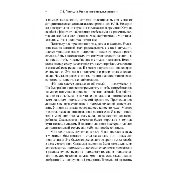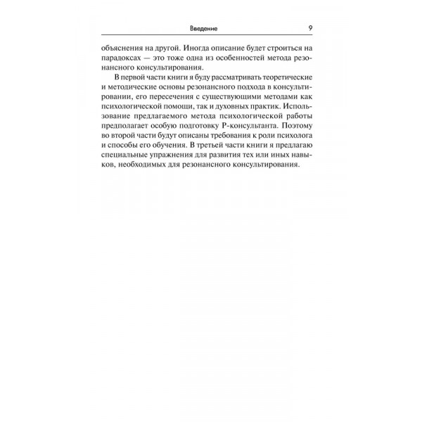 В книге обосновывается новый оригинальны"! метод психологического консультирования. Он является интегративным и включает в себя как элементы современной практической психологии и психотерапии, так и рахтичные техники, заимствованные из духовных традиций. Спецификой данного метода является построение особых отношений в процессе консультирования между психологом и клиентом, которые называются резонансными. Особый акцент в его описании делается на использовании эмоционально-чувственной сферы консультанта как основного "инструмента" диагностики и помощи. В результате такого подхода значительно повышается точность и скорость консультирования. а также снижаются энергетические затраты консультанта. Предлагаются специальные упражнения, которые используются в обучении резонансному взаимодействию.
